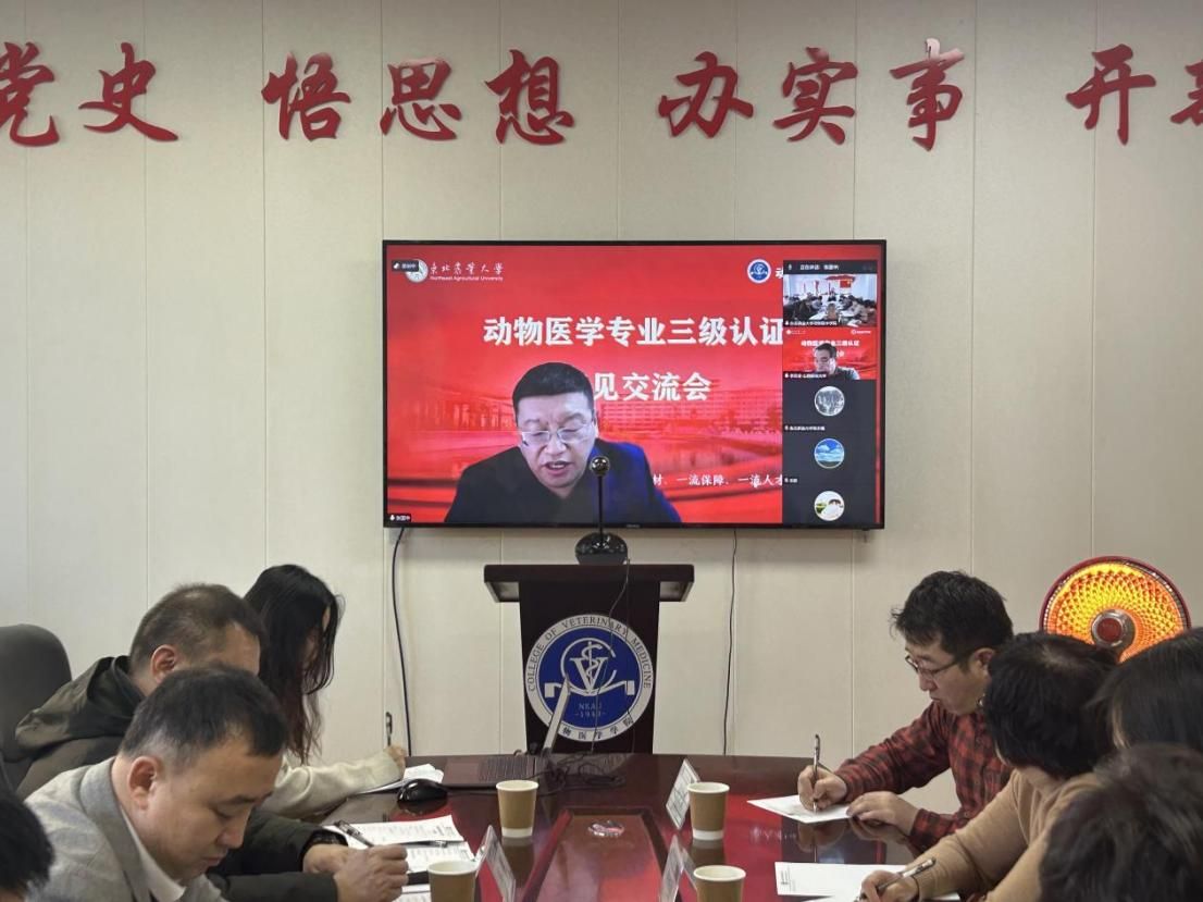 为进一步推进动物医学专业拔尖创新人才培养,提升服务国家重大战略需求能力,威廉希尔中文官网于12月12日下午在威廉希尔中文官网202室召开了动物医学专业国家三级认证(试点)专家意见交流会,会议采取线上线下结合方式。中国农业大学张国中教授、山西农业大学李宏全教授、湖南农业大学孙志良教授、专家组秘书张欣和williamhill官网教务处处长张永强出席线上交流会,威廉希尔中文官网领导和教师代表出席参加线下会议,会议由威廉希尔中文官网院长李金龙主持。据悉,教育部教育质量评估中心在全国70个专业开展农学门类专业第三级认证试点工作,我校农学、园艺、动物科学和动物医学4个专业作为首批认证试点专业接受专业认证。